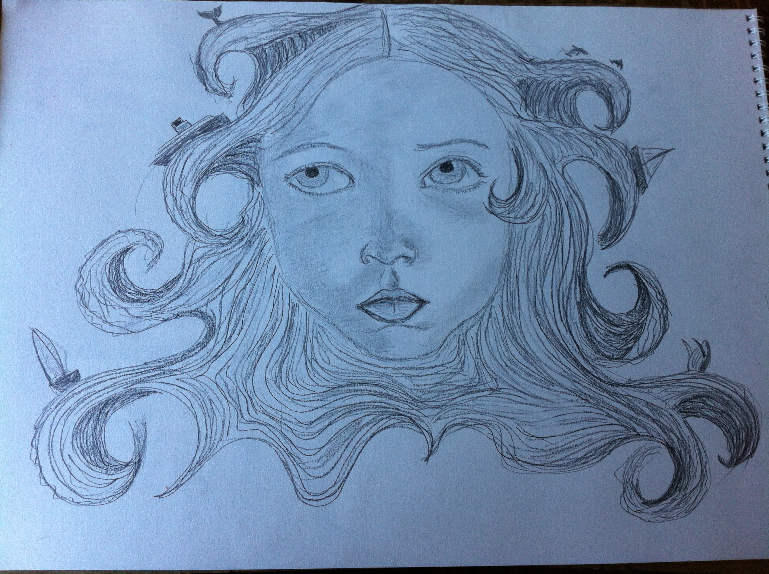 Es un cuadro precioso; María! me encanta el efecto olas que hace el pelo, los colores…. y, como siempre, la imaginación que le has puesto!