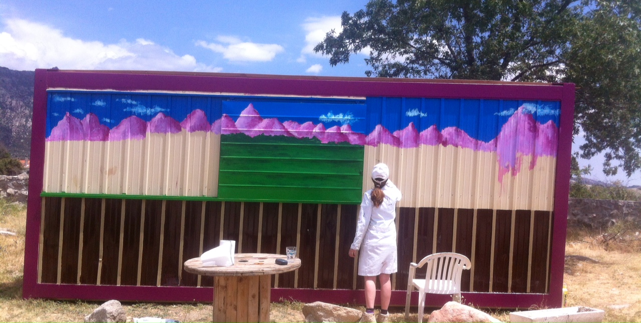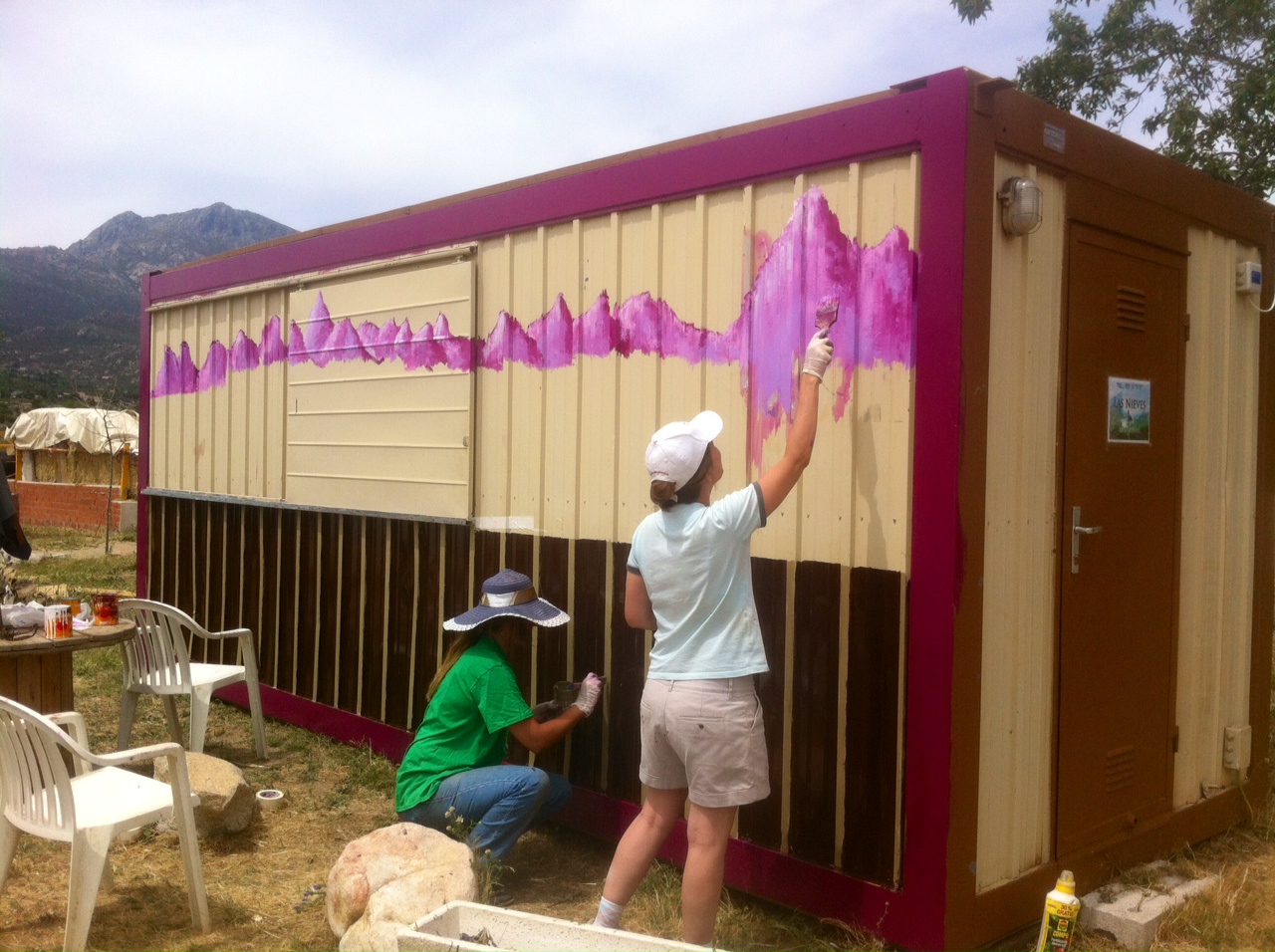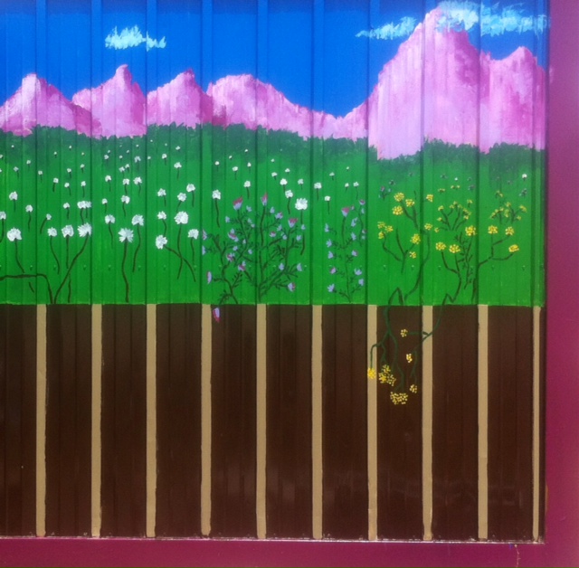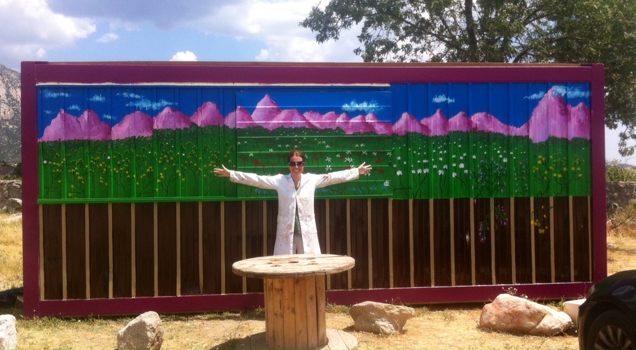 Me habian encargado un trabajo complicado y a la vez apasionante, realizar un mural en una oficina de chapa, no puedo mostrar como estaba antes de hacerlo, se me olvidó hacer una foto, pero no sabia donde me metia hasta que empecé, el reto me podía, me lancé al estrellato. Después de muchas horas de calor y con ayudantes estupendas pude terminarlo.